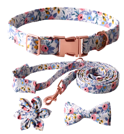 Paw-fect for any fashion-forward furry friend, our Collar/Leash/Bow Set is a must-have for stylish strolls! Made of comfortable cotton with beautiful flower accents, this set features gold tone buckles for a touch of sophistication and blue and pink flowers that pop. Leash, collar, bow and rosette included! Woof-tastic!